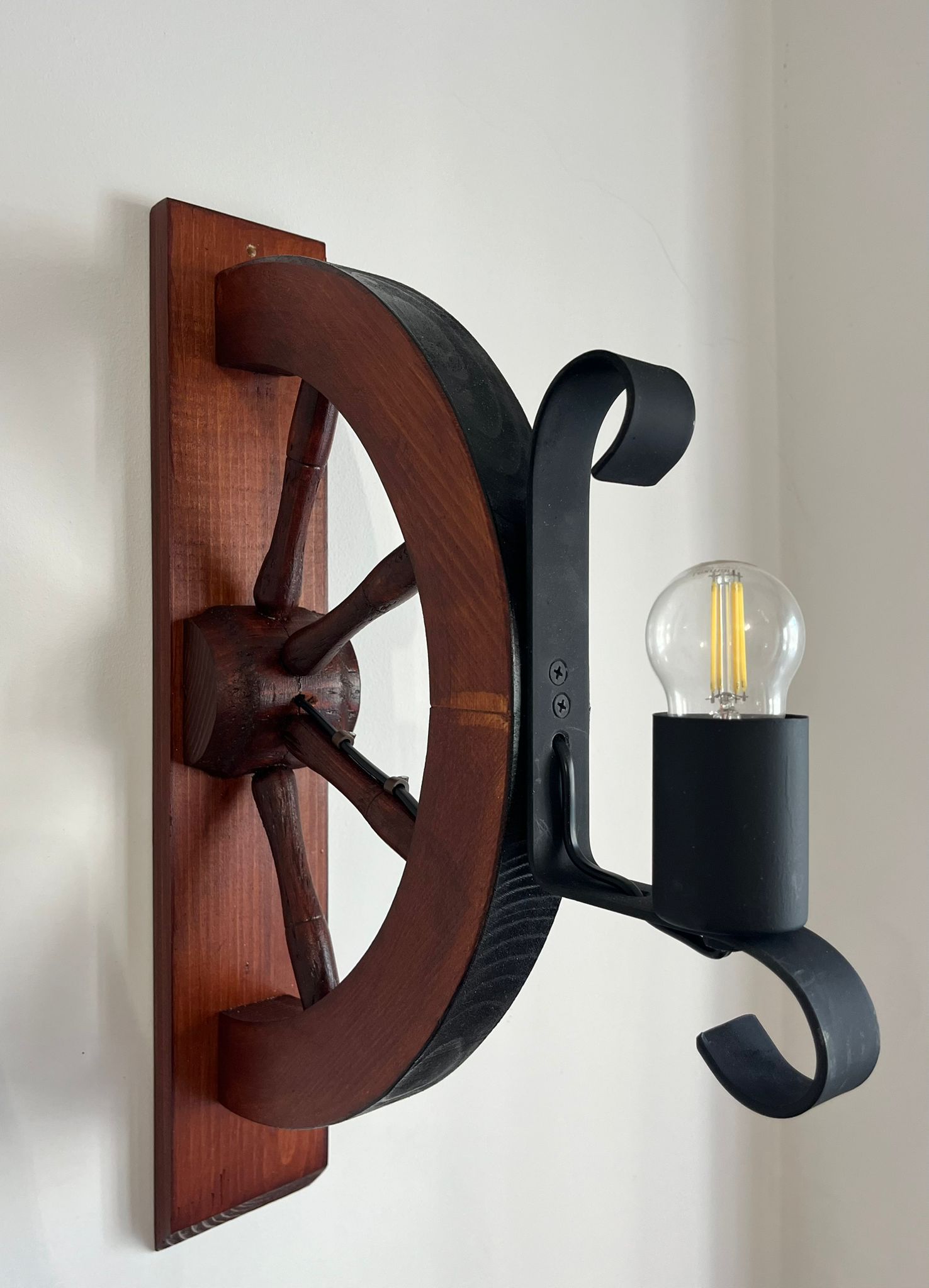 Această aplică decorativă este un element de iluminat cu adevărat special, inspirat din forma roții de căruță, realizată manual din lemn masiv și fier forjat.