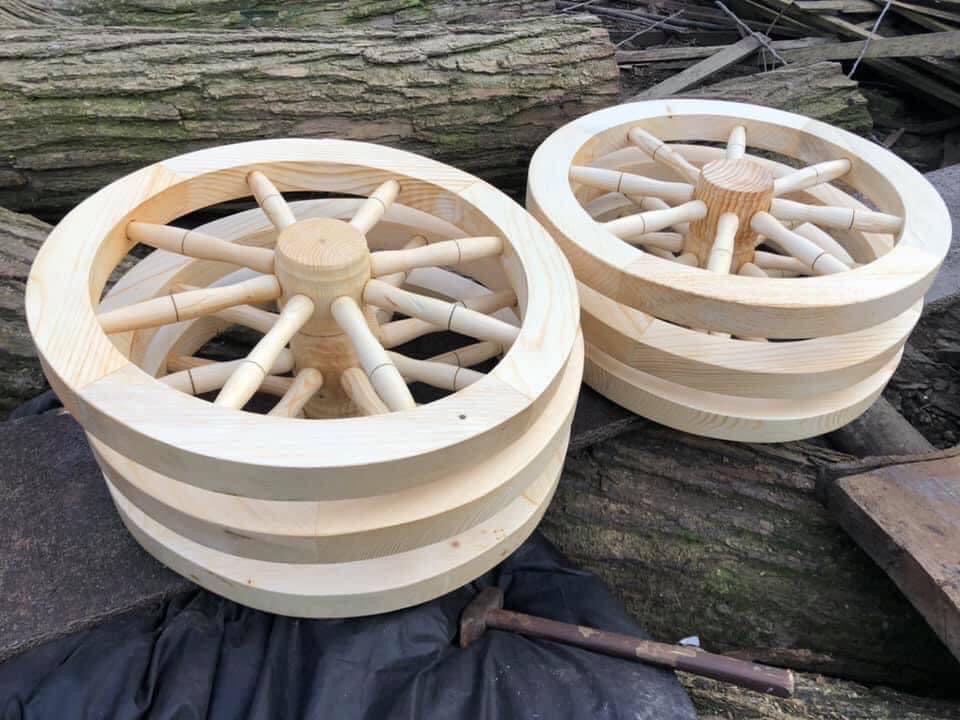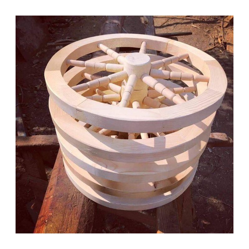 Realizată manual, cu grijă pentru detalii, roata are un diametru de 50 cm și este confecționată din lemn , lăsat în stare naturală pentru a putea fi personalizat (lăcuit, vopsit sau ars).